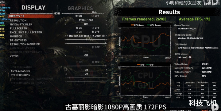 具体的还是回归到游戏中来,根据UP主的一些测试,黑神话悟空在稍微调整画质的前提下可以保证50帧的稳定输出,而作为硬件测试标杆3A大作,《古墓丽影暗影》1080P最高画质之下也能保证172FPS的稳定输出,可见在游戏环境下的表现尤为亮眼。